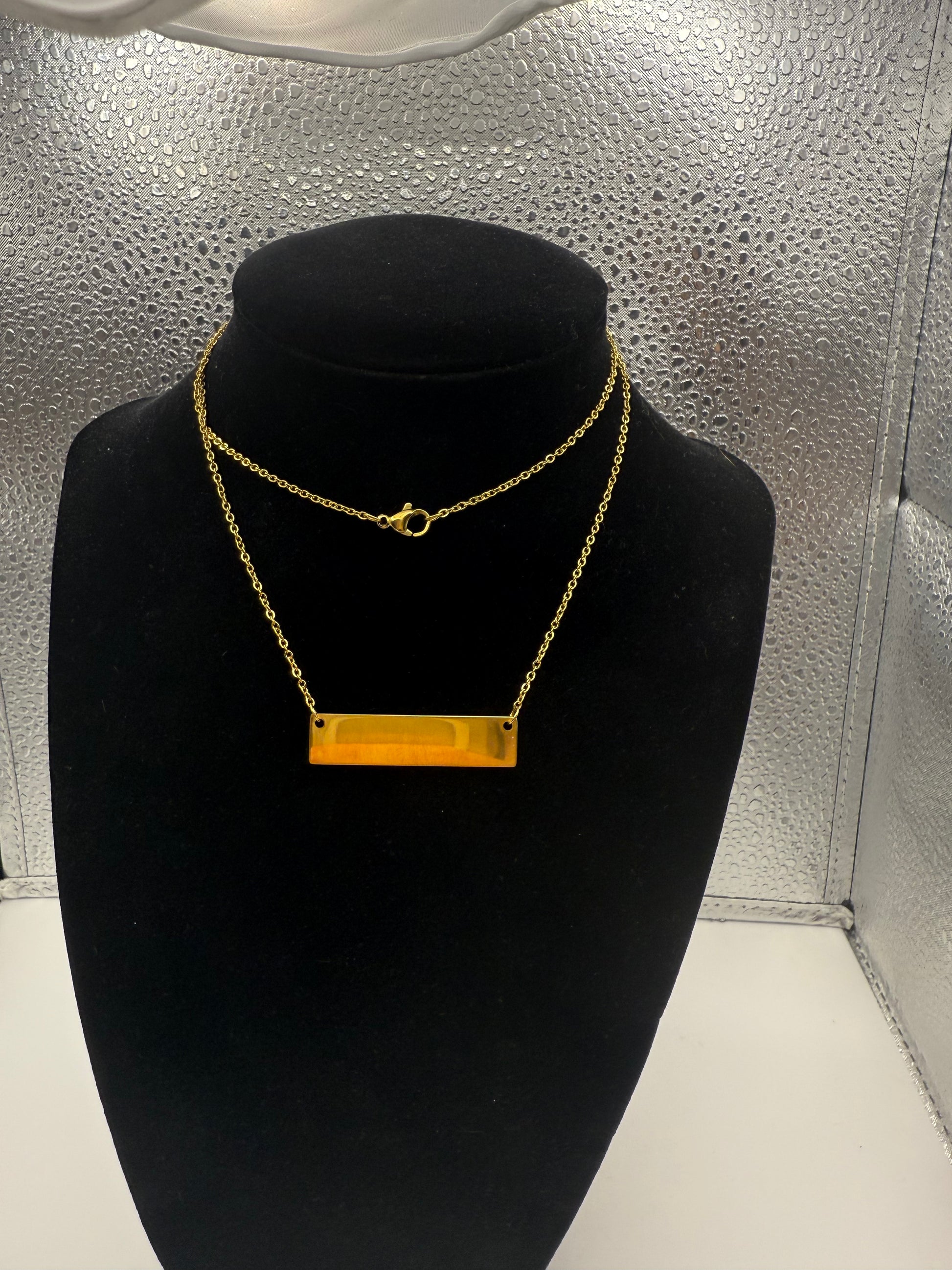 Effortlessly elevate your style with our custom engraved bar necklaces. Crafted from durable stainless steel, these necklaces are available in silver, gold, and rose gold colors. Personalize them with any message for a truly one-of-a-kind accessory. Stay chic and unique.