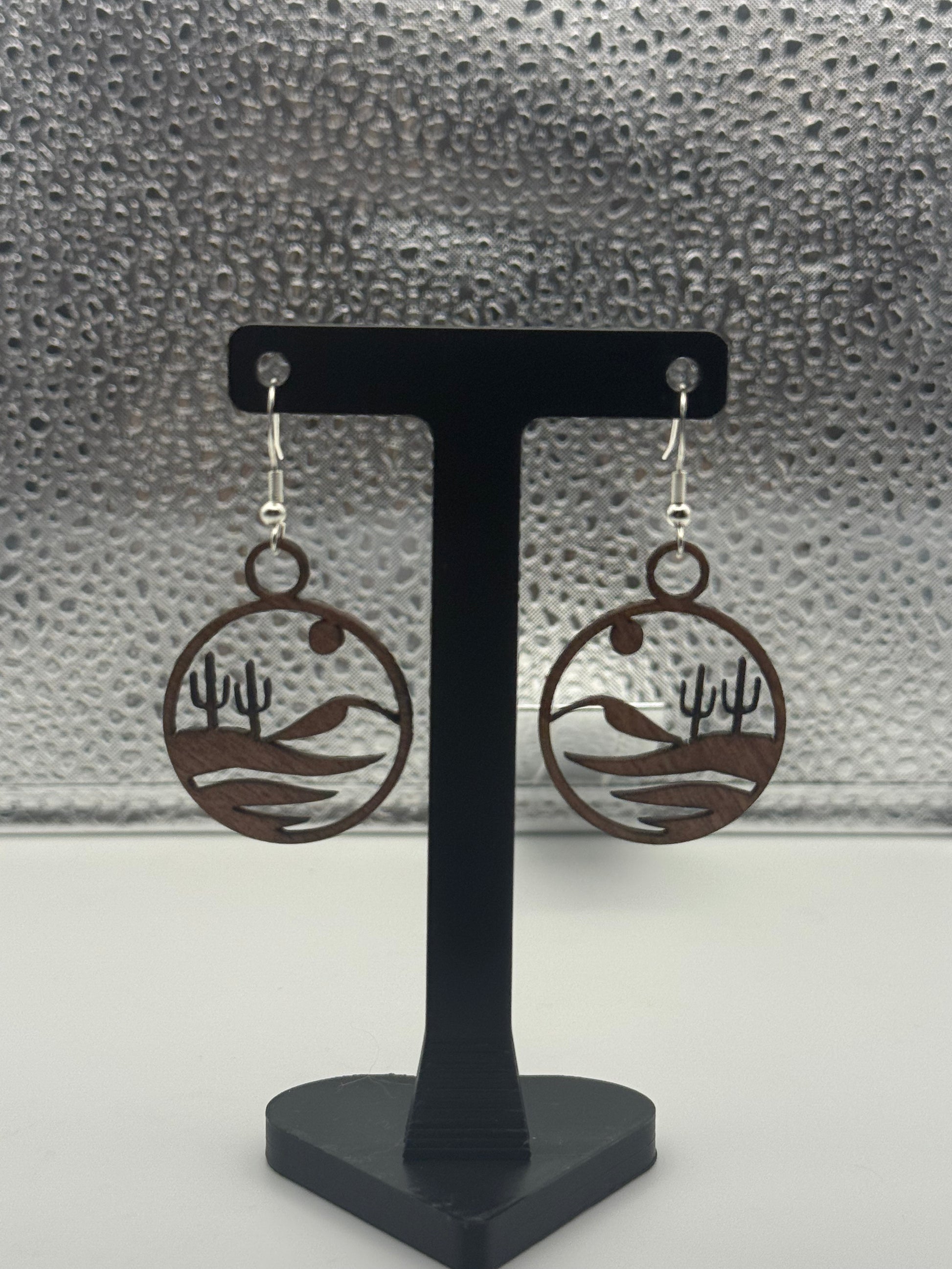 Experience the beauty of the desert with our Desert Landscape Earrings. Made from high-quality wooden material and finished with a rich mahogany stain, these earrings are sure to stand out. The sterling silver loops ensure a comfortable and secure fit. Elevate your accessory game with these unique statement pieces.